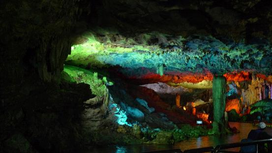 跟著導游走了沒多遠,就上了游艇。游艇在昏暗的燈光指引下慢慢向洞的深處游去,一個個奇異造型的鐘乳石映入眼簾,在燈光的照射下發出璀燦的光芒。游客們都發出嘖嘖的贊嘆聲。感嘆大自然的神奇。